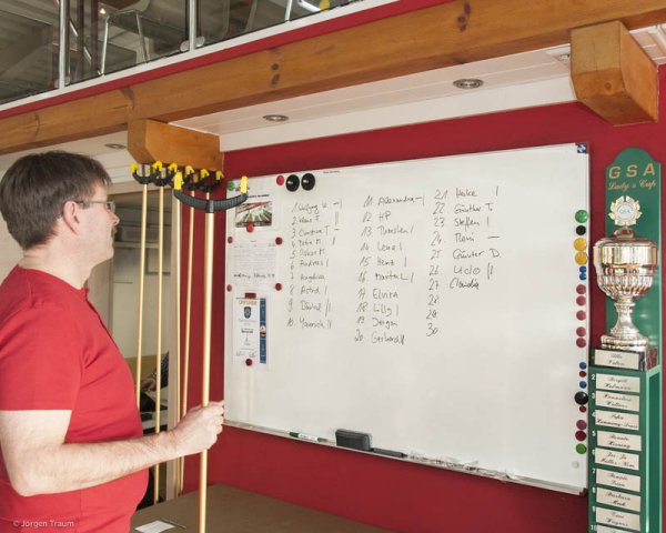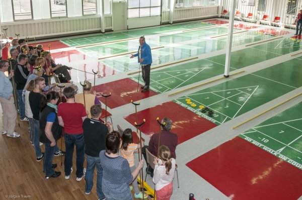 Kurz vor 16 Uhr trafen sich am 8. März bei bestem Wetter ca. 30 BCKL-Mitglieder und fielen gesammelt in der Shuffleboardhalle (www.shuffleboardmagic.de) ein. Zu Anfang wurden uns die Spielregeln erklärt und dann durften wir selber die kleinen Plastikscheiben über den Boden schubsen, ja nach Veranlagung mit mehr oder weniger Gefühl...