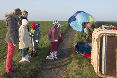 Und das überraschende Ende der Fahrt: Am Landeplatz erwarteten uns Kinder mit ihren Müttern, die uns schon einmal, nämlich am 04.01.2011, bei einer Landung am Ortsrand von Vonhausen begrüßt hatten, damals war Winter und wir landeten im Schnee.